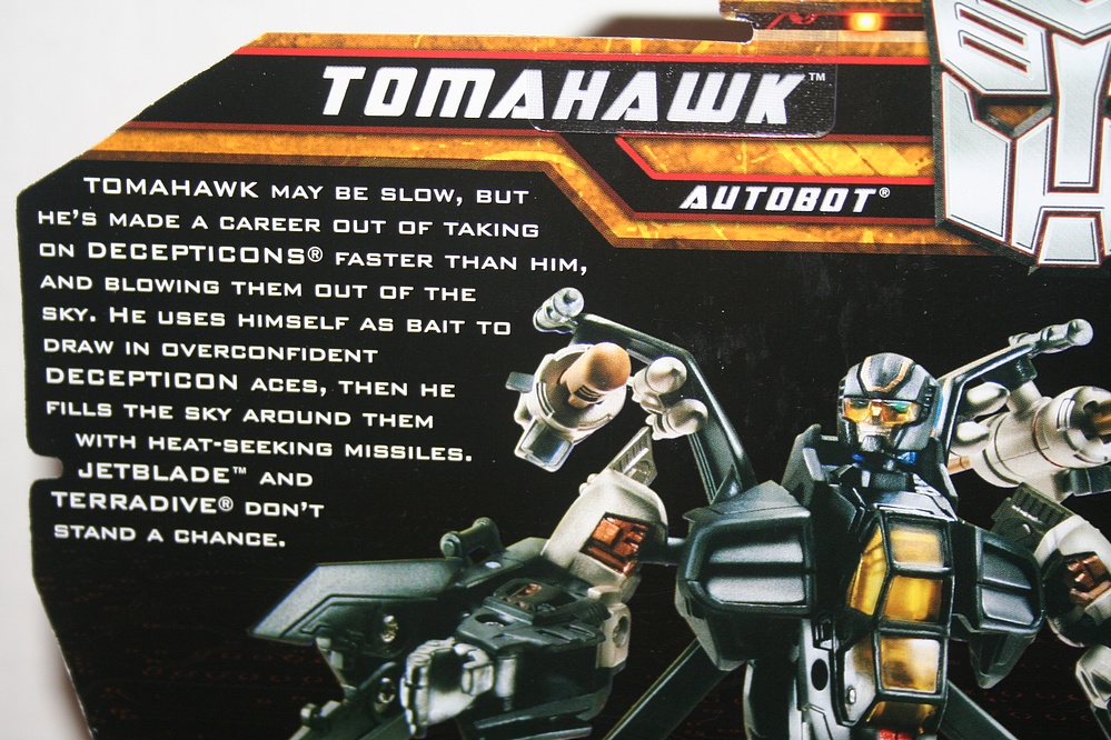 More and more lately, it seems that Hasbro is making an effort to release related figures grouped into their respective waves. I think this is fun, and helps to cross-sell products that are likely to be sitting on the pegs together at the same time, so makes good business sense as well! This may have been going on for decades, but I guess it's just one of many things to which I don't always pay close attention. So, we'll follow Hasbro's lead and today feature Tomahawk from wave 3 of the Hunt for the Decepticons line! The Autobot balance to the skill and fury of Terradive - he may not be fast but he's wily, and high powered! Granted Terradive doesn't have a particularly low intelligence score, but maybe he will fall for the same trap several times out of his sheer frenzy for combat. This vehicle is another solid new addition to the line, and we can take great encouragement from the zero-kibble, aviator-shaded, even smiling, face that Tomahawk is sporting. Keep up the good non-movie work guys! Collector Note: No extra stickers on the packaging for this figure, unlike Terradive! Posted by charlie on November 18th 2010, 08:13 AM Leave Comment