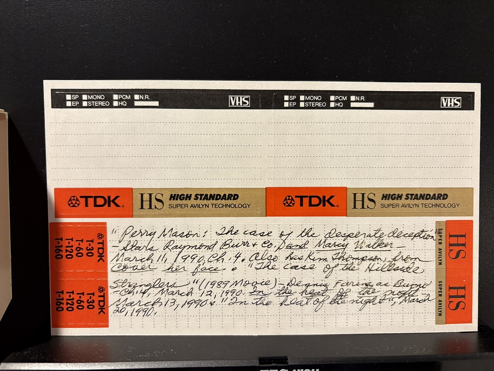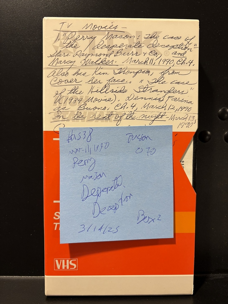 Back of Box: Tucson - Tape 0070 - #1538 - Perry Mason "The Case of the Desperate Deception" (Ch. 4, March 11 1990) - Perry Mason "The Case of the Hillside Stranglers" (1989 movie) (Ch. 4, March 12 1990) - In the Heat of the Night (March 12, 20) tucson box 2